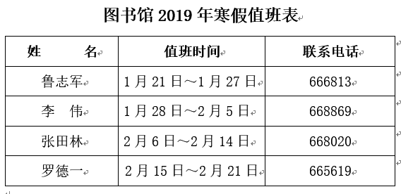 图书馆2019年寒假值班表