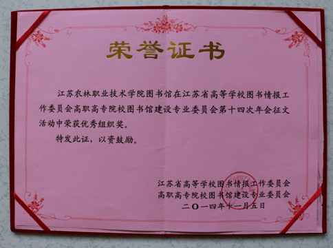 2014年11月14日,江苏省高校图工委高职高专图书馆建设委员会第十四次年会暨学术研讨会在江苏工程职业技术学院(南通市)举行。会议以繁荣学术研究,促进江苏高职高专图书馆事业的发展为主题。学院图书馆积极组织人员参与年会各项活动,其中周琴老师撰写的《基于知识单元的专业课程导读书目构建与服务》获一等奖,高原老师撰写的《江苏43所本科院校图书馆参考咨询现状调查与对策》获二等奖,学院图书馆获“优秀组织奖”荣誉称号。